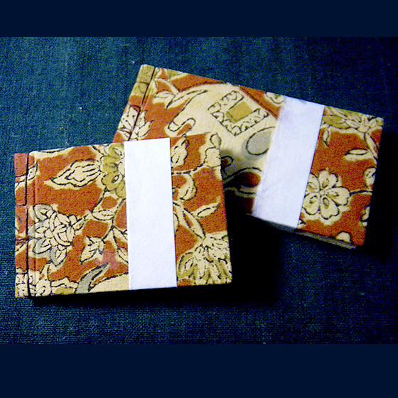 工房で染めた布か蒐集している古布を用いることが柱です。和紙にもこだわりがあり、美濃和紙や黒谷和紙をよく用います。また見返しにも工房制作の木版刷り紙を用います。