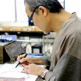 ひとつずつ丁寧に染料をつけ心を込めて押していきます。約5000個強の版木でオリジナルの組み合わせができます。工房で使用する生地は、国内で手織りの風合を残すように特別発注した物で、仕上がりに深みが出るように草木染を施します。ほとんどは生地に案内線を引いたりせず、上下左右を目視で確認しながら押します。鍋島更紗の文様を復元するために作製した版木を使用して染め上げた生地は、工房の人気柄のひとつです。