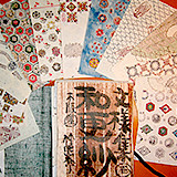 講師オリジナルの手彫りの木版約5000個強の中から自由に組み合わせを選び、創作更紗を楽しみます。生地は国内で特別発注した手織り独特の風合いのものを使用し、そこに草木染めを施しています。木版の線を生かしながら彩を差し、更紗の歴史を感じながら各自のペースで制作します。そして個性を引き出し、すばらしい作品を作り上げます。型染めは日本古来の染色技法で絵文様を描き彫り、染色を施します。
