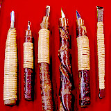 材料は主に100年近く枯れた朴(ほう)の木や桜、柘植等を使用。材料の準備に20年近くかかりました。デザインは無限です。版木を彫る刀や道具類は全部工房手作り。持つところを藤で巻くと彫りやすくなる工夫がされています。そうする事で微妙な使い易さが生まれます。2016年現在の木版は約5000個。木箱に入れて保管中。進行形で新しい版木が増えています。日本で木版をオリジナルに作製し木綿の作品に仕上げる唯一の工房です。気分がのると一日中版木を彫ります。手のひらに乗る大きさくらいでしたら、早いものですと2時間程でしあがります。