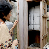 色差しが済めば蒸しをして出来上がりです。布と布が重なると染料が移るために、一枚ずつ不織布で包みます。