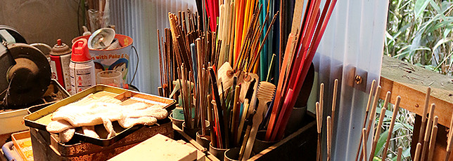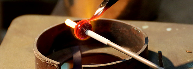 ガラスを熱の中で溶かしながら作業を進めます。美しく、また均等に丸くするのは技術が必要になります。均等に丸くするコツがわかり始めると柄を付けたくなります。鉄筆で模様にしたり、別で作った小さな部品を埋め込むことができるようになると、どんどん世界が広がります。