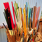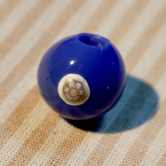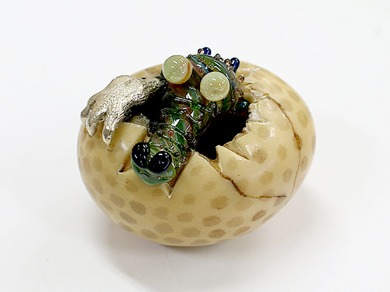 トンボ玉とは穴のあいたガラス玉のことを指し、大変古くからある技術です。竹岱亭では袋物の根付代わりや、彫金の作品と組み合わせてアクセサリーに加工するなどしています。